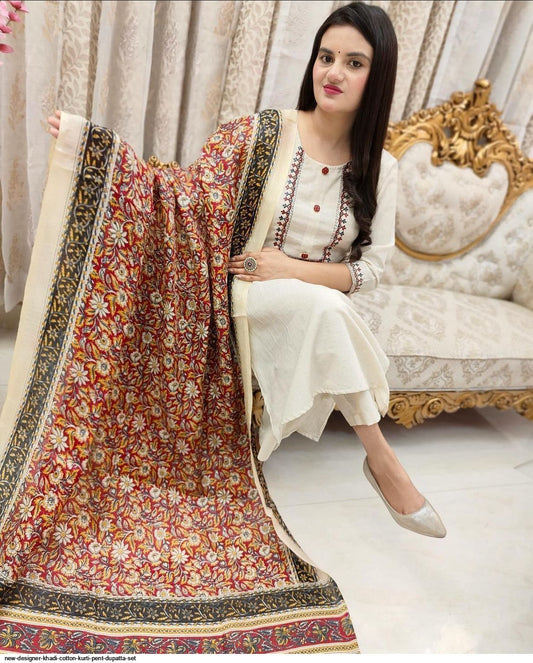 New Designer Khadi Cotton Kurti Pant Dupatta Set